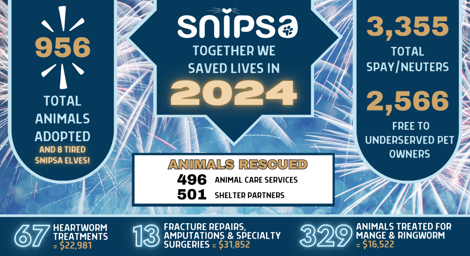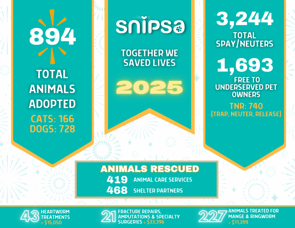Every time you make a donation to SNIPSA, you are directly contributing to an animal’s care in our program. Click the button below to view our donation options. One of our rescues will THANK YOU!